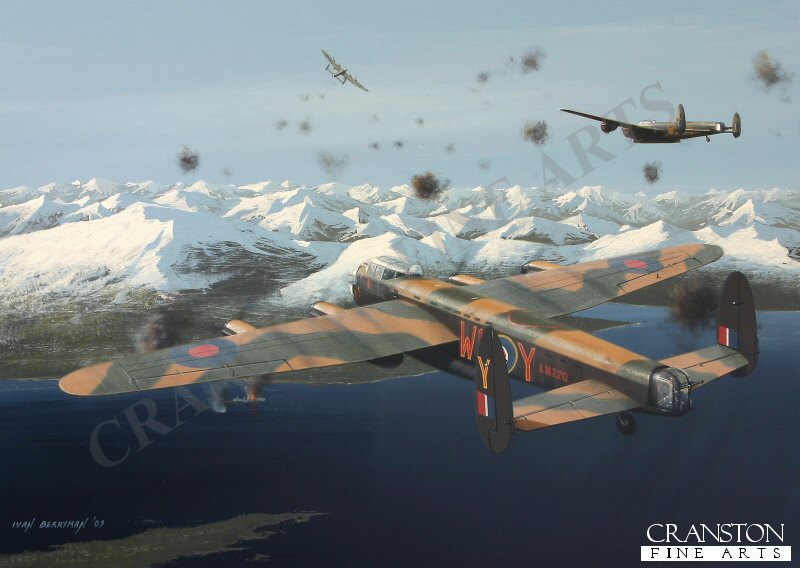 On 12th November 1944, the mighty Tirpitz was finally destroyed by a combined force of Lancasters from No 9 and No 617 Squadrons. LM220, an aircraft of 9 Sqn is shown here making its run toward the target at approximately 09.40 hours on that fateful day.