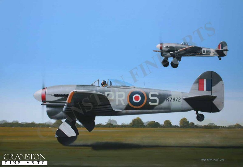 609 Sqn Hawker Typhoons are shown taking off from Manson in Kent in February 1943. Nearest aircraft, R7872 (PR-S) is that of Sgt John Johnny Wiseman, the other, DN294 (PR-O) being the mount of Fl Sgt Alan Babe Haddon. Both aircraft were tragically lost during an action on 14th February, the pair being taken by surprise by Focke-Wulf 190s over the Channel, Wiseman losing his life in the incident.