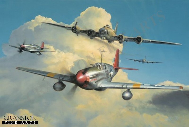 With the words of his Group CO ringing in his ears, a pilot of the 332nd Fighter Group returns to protect a crippled American B17 bomber after downing two Me109s in quick succession. Agonisingly, two more enemy fighters were left to escape but the pilot knew that under the strict leadership of Colonel Benjamin O Davis, his mission, and that if the other all-black pilots of the 332nd, was solely to protect the bombers. That iron discipline was to earn this famous unit the respect and admiration of hundreds of bomber crews, and to create a legend. Despite lingering racial prejudice and some opposition within the Air Force, President Roosevelt had ordered the USAAF to form an all-black fighter pilot unit, its crews to be trained at Tuskegee in Alabama. To the surprise of their critics, the Tuskegee Airmen were to prove their detractors spectacularly wrong from the first day they went into action in Italy in May 1943. Flying first with the Twelfth Air Force, then the Fifteenth, the four squadrons of the 332nd completed over 15,000 combat sorties, destroyed over 250 Luftwaffe aircraft in the air and on the ground, 950 railway trucks and locomotives, and even sunk a destroyer by machine gun fire! The Group was awarded a Presidential Unit Citation, their pilots decorated with over 1000 medals for gallantry. But above all, with the spinners and tails of their P-51 Mustangs brightly painted red, the Red Tails as they were affectionately known, became the only US Fighter Group that never lost a bomber in their care. The Tuskegee Red Tail pilots of the 332nd Fighter Group are a more than welcome sight as they close in to escort home a damaged B17 Fortress of the 483rd Bomb Group. Seen high over the Italian Alps during the summer of 1944 this poignant scene conveys precisely the story of the legendary Red Tails.