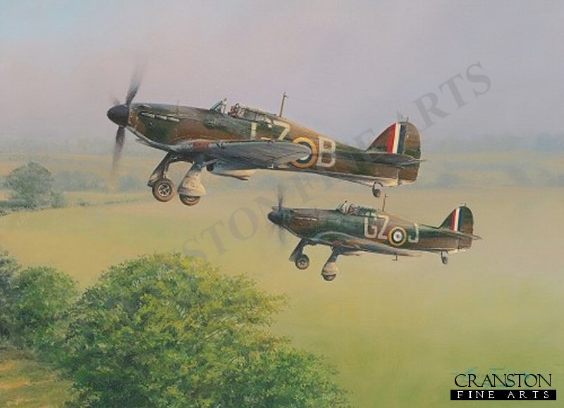 You can almost hear the roar of their mighty Merlin engines and feel the prop-wash in this salute to the Hawker Hurricane. This classic portrayal of this much-loved fighter depicts a pair of Mk.I Hurricanes from No.32 Sqn leading the scramble away from their forward airfield. Often making three, four or five such scrambles a day at the height of the battle, this time they are racing to intercept Luftwaffe intruders who have been spotted crossing the Kent coast.