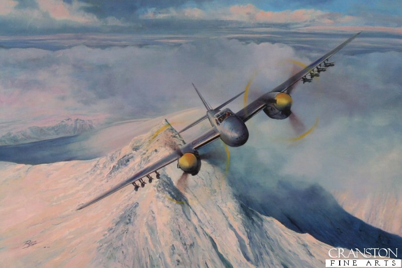 A fine study of a lone Mosquito FB MkVI of 143 Squadron, part of a larger formation of the Banff Strike Wing, high over the Norwegian fjords on an armed rover patrol to seek out enemy surface shipping and submarines, in February 1945. The beauty of the early morning sun, glinting on the snow-covered mountain-tops, contrasts with the menacing job in hand. Bravery, inordinate flying skills, and determination were a prerequisite for the crews of Coastal Strike Command.