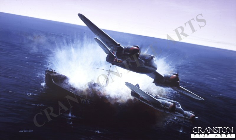 Without doubt one of the most outstanding and versatile aircraft in the Allied inventory during World War II, the Bristol Beaufighter was to endure a cautious reception by its crews when it first entered service, not least due to difficulties experienced by crews attempting to abandon a stricken aircraft in an emergency. Its performance and hard-hitting potential quickly overcame such doubts, however, and it went on to earn a commendable reputation - and the nickname Whispering Death. Here, two 254 Sqn TF. MkXs attack a captured Norwegian vessel in 1945.