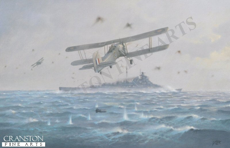 Shows the action on 26th May 1941 by Swordfish from HMS Ark Royal on the German battleship Bismarck. Fresh from her triumphant encounter with HMS Hood, Bismarck was struck by Swordfishs torpedo which jammed her rudder and was finished off by the home fleet on 27th May 1941.