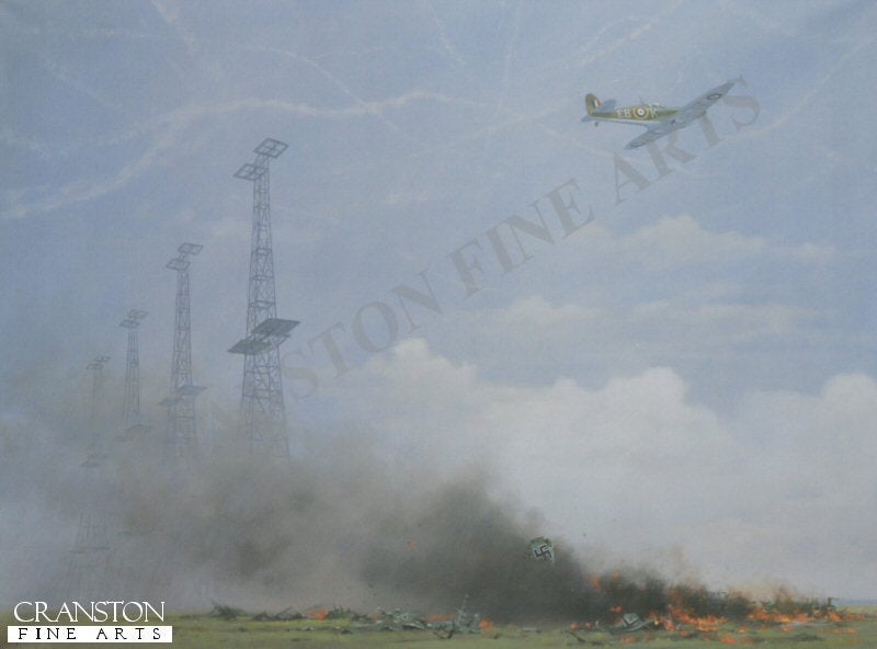 A solo Hurricane flies over the remains of a downed German bomber during the Battle of Britain. Also shown in the painting are the early warning radar towers which played a significant part in the detection of German aircraft and their number, helping the RAF win the Battle of Britain.