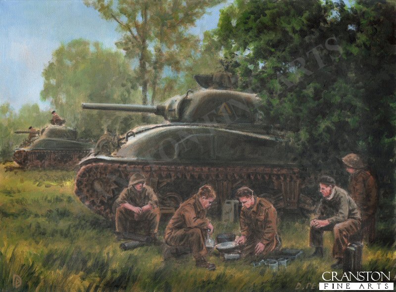Colomby-Sur-Thaon, Normandy, 11th June 1944. British Sherman MkII's of 4th Armoured Brigade, enjoy a tea break prior to being sent to support Canadian troops against an expected German attack. The Brigade consisted of the 2nd Dragoon Guards The Scots Greys, 3rd County of London Yeomanry The Sharpshooters, and the 44th Royal Tank Regiment.