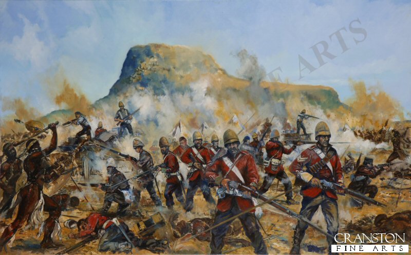 The Battle of Isandlwana on 22 January 1879 was the first major encounter in the Anglo-Zulu War between the British Empire and the Zulu Kingdom. Eleven days after the British commenced their invasion of Zululand in South Africa, a Zulu force of some 10,000-12,000 warriors attacked a portion of the British main column consisting of about 1,800 British, colonial and native troops and perhaps 400 civilians. The Zulus were equipped mainly with the traditional Assegai iron spears and cow-hide shields, but also had a number of muskets and old rifles though they were not formally trained in their use. The British and colonial troops were armed with the state-of-the-art Martini-Henry breech-loading rifle and two 7 pounder artillery pieces as well as a rocket battery. Despite a vast disadvantage in weapons technology, the numerically superior Zulus ultimately overwhelmed the poorly led and badly deployed British, killing over 1,300 troops, including all those out on the forward firing line. The Zulu army suffered around 350 killed, and up to several hundred wounded. The battle was a crushing victory for the Zulus and caused the abandonment of the first British invasion of Zululand.