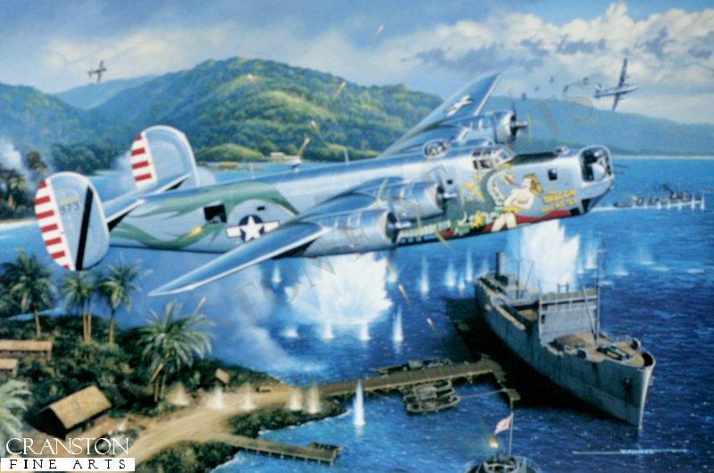 The only flyable B-24 Liberator aircraft in the world, serial no. 44-44052 is the aircraft owned and operated by the Collings Foundation, and named after The Dragon and His Tail, a lavishly decorated B-24 that flew in the Pacific during WW II. The B-24 did not get the attention or fame of the B-17 either during or after the War. With longer range and bigger bomb loads than the B-17 the B-24s were generally based far from London. As a result, most war correspondents looked for stories at the B-17 fields and avoided the long treks to the B-24 fields. The B-17 also looked more modern and more powerful, although this was not an accurate assessment. The B-24 that has been restored by the Collings Foundation was built in August 1944 by Consolidated Aircraft at the companys huge Ft. Worth assembly plant. Originally delivered to the USAAF the aircraft was shortly transferred to the Royal Air Force. Under British Flag the plane saw combat service in the Pacific in operations ranging from anti-shipping to bombing, to re-supply. At Wars end she was abandoned to an aircraft graveyard in Khanpur, India. In 1948 the aircraft was restored by the Indian Air Force and it saw service until 1968. She sat abandoned in India until 1981 when famed British aircraft collector, Doug Arnold, purchased her and had her disassembled for shipment back to England. She was sold in 1984 in as is condition to the Collings Foundation and was returned to America in 1984. Restoration commenced in 1985 with General Dynamics acting as a major sponsor of the restoration. More than 420,000 rivets were replaced during the restoration that involved rebuilding more than 80% of the aircraft's parts. The completed B-24 was originally named All American in honor of an Army Air Force B-24 of the same name. The original All American shot down fourteen enemy fighters in a raid over Germany on July 25, 1944. That aircraft was lost on a combat mission when it was shot down over Yugoslavia in October of 1944. In 1998 the Collings Foundation renamed its B-24 The Dragon and its Tail to honor an aircraft than served with the 64th Bomb Squadron of the 43rd Bomb Group in the Pacific. The original Dragon survived the War, and was the last B-24 scrapped in Arizona. In Stan Stokes marvelous painting the original Dragon is depicted during a typical anti-shipping mission.