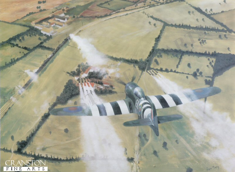 Hawker Typhoon of 181 Sqdn, 2nd tactical airforce. The Dreaded Salvo was painted to celebrate the 60th anniversary of D-Day. Preparing the ground for the eventual D-Day landings,aircraft including the Hawker Typhoon were given the freedom to scour areas for evidence of enemy activity and neutralise there effect employing the terrifying power of the eight underwing rockets. Turning a massive 14 diameter 4 bladed prop. the Napier Sabre engine was huge, but unfortunately suffered mechanical problems that blighted its early acceptance.