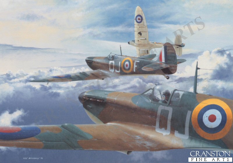 Depicting Spitfires of No.92 Squadron, which on their first mission over Dunkirk, encountered six ME109Es and succeeded in shooting down every one of them! Such actions came to symbolise the spirit of the 92nd Squadron which went on to see intense fighting during the Battle of Britain and by the end of 1940 had claimed an astonishing 127 enemy aircraft destroyed. A dramatic and unusual perspective on this classic aeroplane addition to any collection of Spitfire paintings.