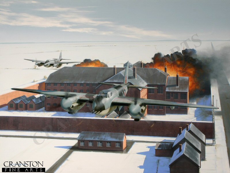 On 18th February 1944, nineteen De Havilland Mosquito Mk.VIs and one photo-reconnaissance aircraft took off on a mission to attempt to free 120 French patriots being held captive by the Nazis in the prison at Amiens. Codenamed Operation Jericho, the attack on the jail was to be carried out in up to three waves - the first to break the prison walls in two places, the second to bomb the main building and a third standing by, should either of the first two fail. The mission was a complete success despite some losses on the ground and two aircraft destroyed. Here, the iconic moment is captured as a pair of Mosquitoes of 487 Sqn are seen breaching the wall at 12.03 hours.