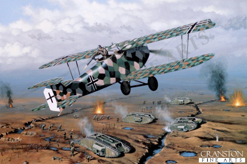 By the spring of 1918 WW I was fast approaching its climax. In the East, Russia had collapsed, allowing Germany to amass a force of 3.5 million troops in 194 divisions on the all-important Western Front. The German strategy was to end the War before the full brunt of American involvement could swing the balance irretrievably in favor of the Allies. In an offensive of titanic proportions, later known as the Kaisers Battle, German forces strove to break the three-and-a-half year stalemate in trench warfare. This massive offensive would combine the use of sturmtruppen trained to infiltrate Allied positions, massed artillery attacks, and finally schlachtstasffein which were formations of specialized ground attack aircraft. These units, while lacking the publicity of the fighter squadrons, played a more offensive role than any other aircraft of WW I. As part of German industrys Amerika Programm, begun in mid-1917 to counter the anticipated arrival of an American air armada, the Imperial German Air Force called for the development of a new light, compact, highly maneuverable, two-seat aircraft to be known as the CL class. These new aircraft were to be offensive machines to be used to escort bombers and strafe trenches. One of the most successful of the new class of aircraft was the Hannover CL IIIa. The Hannover, as a single-engined aircraft, was unique in having a biplane tail. Its purpose was to reduce the tailplane span, thereby affording a wider field of fire for the observer/gunner. For a two seat aircraft the CL IIIa was a smallish (38 foot wingspan) and compact aircraft, and was often mistaken by Allied scouts as a single seater, whereupon they were speedily disabused of their illusion by a hail of fire from the observers Parabellum machine-gun. The small size of this aircraft imparted great maneuverability and an excellent field of view for its pilot. Powered by an Argus As III engine, the Hannover also utilized a plywood fuselage, giving the aircraft great strength and the ability to withstand a lot of punishment. These characteristics made the CL IIIa an ideal ground attack aircraft. More than one thousand of these airplanes were built, and they entered service in late 1917. The Hannoveranas, as they were called by the RFC, were without doubt, formidable opponents. Major James McCudden, V.C., the RFCs fourth ranking ace with 57 victories, was to write: These machines are very deceptive and pilots are apt to mistake them for Albatros scouts until they get to close range, when up pops the Hun gunner from inside his office. Johann Baur, who later became the personal pilot of Adolf Hitler, flew Hannovers and claimed nine victories. In Stan Stokes dramatic depiction, a CL IIIa strafes counter-attacking British Mk IV tanks in a shell pocked landscape during the Spring offensive of 1918, Germanys supreme bid for victory in the West.