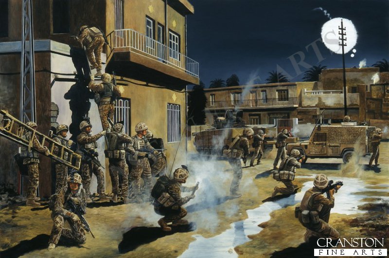 The scene depicts a strike operation in downtown Basra, Iraq. This type of operation was conducted by all four Companies of the 2nd Battalion The Royal Anglian Regiment 'The Poachers' throughout the period April to November 2006, whilst deployed on Operation TELIC 8.