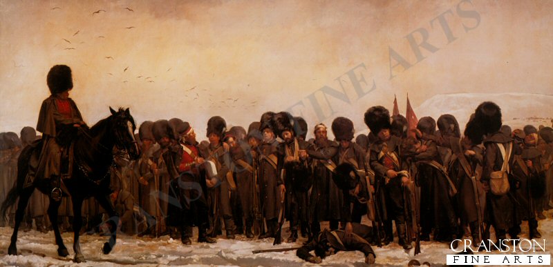 Grenadier Guards exhausted, standing in the snow after the battle, during the Crimean war awaiting the reading of the Roll Call. Published by Pompador Gallery in 1987, this print sold out at the publisher over eighteen years ago. Although their condition is not perfect, they are good to the eye. They are very rare items - we have only 20 prints remaining.