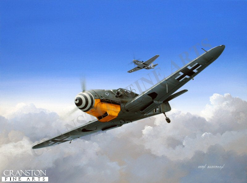 Credited with more than 130 victories in World War Two, Alfred Grislawksi scored 24 of these on the Western Front. He is depicted here flying his Me109 with JG53 in what would be his last combat on 26th September 1944. Having shot down a P-38 Lightning earlier in the day, he was shot down in the combat shown by the P-51 Mustang of American Ace Hub Zemke and bailed out. Opening his parachute very low for fear of being shot at, he landed hard and damaged vertebrae, and did not recover before the end of the war. Awarded the Knight's Cross with Oak Leaves, he died in 2003 aged 83.