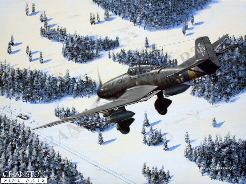The most highly-decorated Luftwaffe pilot, Hans-Ulrich Rudel is the sole recipient of the Golden Oak Leaves supplementary award to the Knight's Cross, to add to the Swords and Diamonds. These awards reflect his quite incredible achievements with the Ju87 Stuka dive-bomber - he flew more than 2,000 missions, claiming more than 500 tanks amongst around 1,500 ground targets destroyed, plus a battleship, cruiser, destroyer and other shipping, as well as a number of trains. Additionally, he flew more than 400 missions in the Fw190 fighter, and is credited with 11 air victories. He lost a leg in combat near the end of the war and was later captured by the Allies, remaining in a POW camp until 1946. He is depicted here in his Ju87 lining up for an attack amongst the snowy landscape of the Eastern Front. Hans-Ulrich Rudel died in 1982.