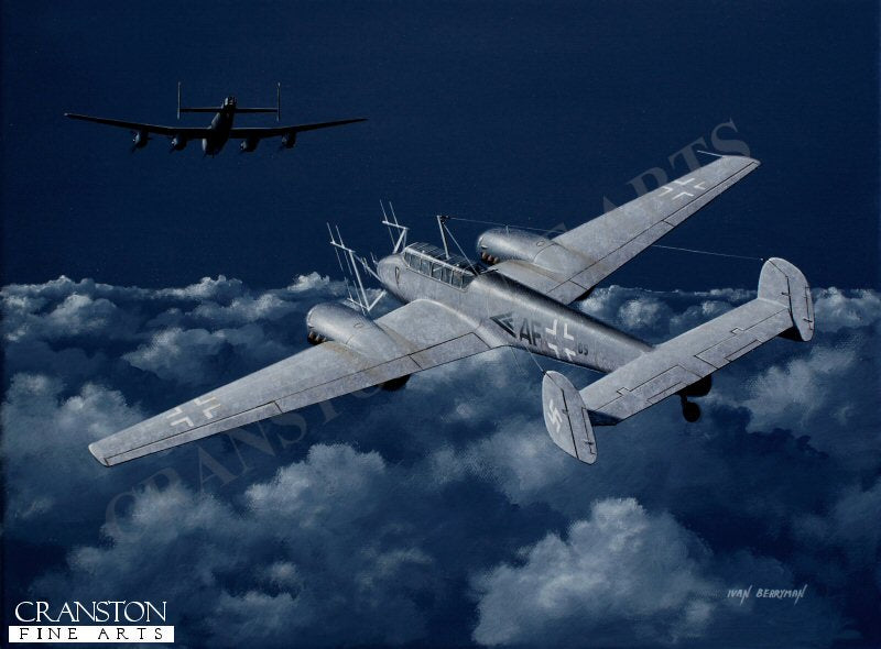 Joining the Luftwaffe in 1936, Helmut Lent flew Me110s with ZG76, claiming victories in the invasion of Poland. It was as a night-fighter pilot that he excelled - the second highest scoring night Ace in history - scoring more than 100 victories for which he was awarded the Knight's Cross with Oak Leaves, Swords and Diamonds. He scored victories from 1941 to 1944 with NJG1, NJG2 and NJG3 before he was fatally wounded in an accident when the Ju88 he was transporting struck overhead wires on a hastily prepared makeshift runway as he came in to land. He is depicted here in his Me110 G4 approaching a Lancaster over France in 1943.