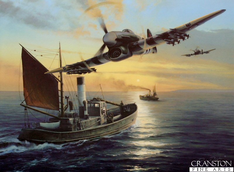 In the months following D-Day, Hawkers hard-hitting, snub-nosed Typhoon struck terror into the German formations in Normandy, crack Panzer units wilted under the constant hail of rockets and bombs. Several times a day the Typhoon pilots would cross the Channel to run the gauntlet of flak and ground fire, and deliver their lethal cargo. The disaster befell the German Army during the third week in August 1944. For over two months, sixteen divisions of the Germany Army had battled to contain the huge tide of the Allied armies as they swept ashore in the weeks following D-Day. Overwhelmed by the size and determination of the invasion force, the Germans fell back amidst bitter fighting, contesting every town, every village, and every hedgerow. But there was one thing they could not fight against - devastating Allied air superiority - and leading the assault were the deadly ground-attack Typhoons of the RAF. Equipped with cannons and eight lethal rockets, the Typhoons simply cut the German Panzer Divisions to shreds, the burning, blasted, and obliterated hulks of tanks and vehicles lay srewn across an ever decreasing battlefield as the Allies fought to snare their enemy within the Falaise Pocket. And ensnare them they did. The only option for the Germans was to surrender or perish. Most choose to surrender, thousands and thousands of crack troops crushed by one of the deadliest air to ground attacks in history. The Typhoons lethal weaponry is clearly visible in Richard Taylors beautiful painting Typhoons Outward Bound. As another fine summer day begins, Typhoon Mk1bs of 247 Squadron are en-route to the Normandy battlefront, the first of several missions that day. Skimming at mast-top height, the Typhoons pass over two ancient steam drifters, conscripted into the wartime role of patrolling the Channel and, should the need arise, rescuing any downed aircrew in need of help.