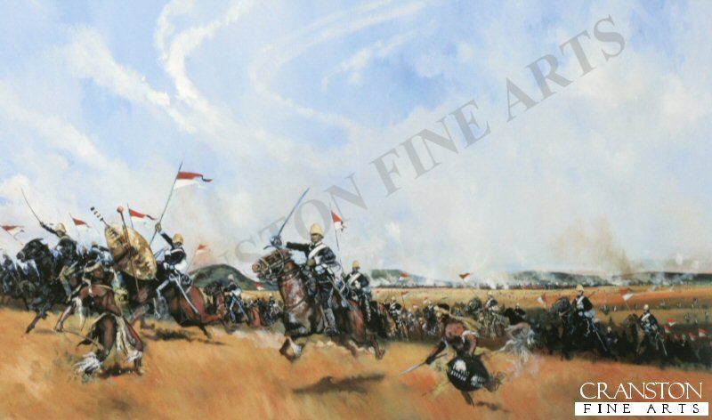 The British force of 17,000 British and native troops, under the command of Lieutenant General Lord Chelmsford engaged over 22,000 Zulu warriors on 4th July 1879 at Ulundi. During the battle several thousand Zulus surrounded the British infantry which formed a square with the 17th Lancers at its centre. When the Zulus attack faltered the 17th Lancers passed out of the back of the square and were ordered to charge. The impact of the charge broke up what was left of the Zulu formations and the Zulu army dissolved in flight. The British casualties at the Battle of Ulundi were 3 officers and 79 men. but it is believed the Zulu losses were around 1500.