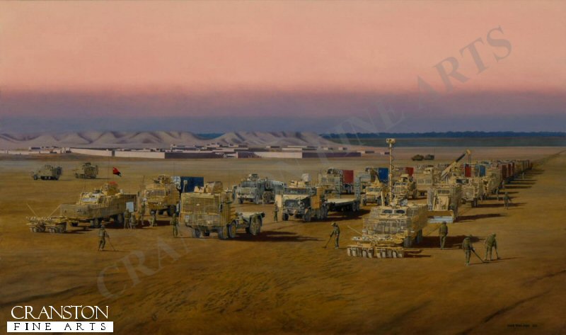 A Combat Logistic Patrol establishes a desert laager for the night, following protracted CLP operations into the Green Zone, Helmand Province, southern Afghanistan. Each CLP traveled in single file during the day, but in the evening would form up in three columns and halt. The personnel immediately carry out clearance drills, searching for IEDs by sweeping the ground around their vehicles with Vallon detectors. A Support Vehicle (Recovery) of the REME with its crane is working to repair a vehicle. The leading vehicles in the column at the right of our view are Royal Engineer assets comprising the Talisman system. A Mastiff command-post with mast-mounted electro-optic sensors has a Remote Weapon System. Behind it is a JCB High Mobility Engineer Excavator; behind it are more RE vehicles including a Buffalo. The leading Mastiffs are also fitted with the SPARK - Self Protection Adaptive Roller Kit for protection against mines and pressure-initiated IEDs. There are some areas of urban desert; that is, in close vicinity of the population but still very much in a desert landscape. Dasht means plain or desert.