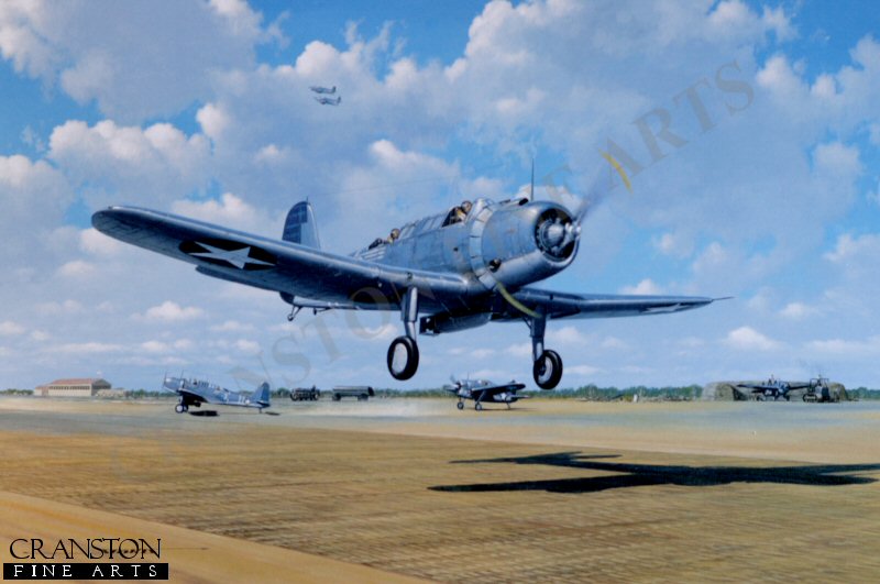 The Vought SB2U Vindicator represents one of those many 1930s era aircraft designs, that despite incorporating advanced aerodynamic design features when compared to earlier models, was technically obsolete at the start of WW II, and hence gets few favorable comments from a historical aviation combat perspective. The first production deliveries of the SB2U-1 dive-bomber took place in 1937. Powered by an 825-HP Pratt and Whitney radial, this aircraft carried a crew of two, and was capable of a maximum speed of 249-MPH and a maximum range of 1,300 miles. The Vindicators service ceiling was 27,500 feet. In early 1938 the Navy ordered 58 more Vindicators, designating this variant the SB2U-2. In 1939 Vought received a contract to supply the USMC with 57 additional Vindicators. These variants, designated the SB2U-3 would have greater fuel capacity and longer range. The 3s also were fitted with 4 forward firing machine guns instead of only one. Having advance knowledge of the Japanese plans to attack and occupy Americas Midway Islands base, the US Navy spent much of the month of May 1942 building-up the defenses on these tiny, but strategic islands. A mixed bag of USAAF, USN, and USMC aircraft had found their way to Midway in hopes of mounting an effective defense and possibly an offensive operational capability against the coming Japanese attack. The aircraft sent included many obsolescent types, but this was all that Admiral Nimitz had at his disposal. The Marine Corps Air Arm was used to getting USN pass alongs of used and worn aircraft as carrier-based units received more modern aircraft. At Midway, the Marines were no exception to this rule, and they found themselves in possession of F2A Buffalo and F4F Wildcat fighters assigned to VMF-221, and SB2U-3 Vindicators and SBD Dauntless dive bombers assigned to VMSB-241. The Vought Vindicators, nicknamed vibrators by their pilots, were technically obsolete USN hand me downs. The SB2Us were partially fabric covered, and in a power dive the wings had a nasty habit of shedding fabric, and hence lift. As a result these aircraft were patched up with a lot of tape, and the recent over painting of the rudder stripes and previous squadron markings gave them a rather ratty appearance. Warned by PBY patrol aircraft of the incoming Japanese air attack, MAG-22 scrambled all available aircraft just before 6:00AM on June 4, 1942. The 12 Vindicators available took off armed with 500-pound bombs mounted on their centerline bomb racks. In Stan Stokes painting a heavily laden Vindicator struggles for altitude in the first phase of the Battle of Midway.