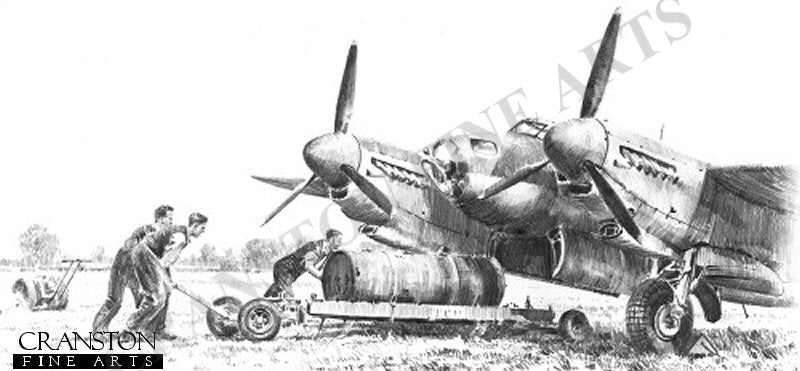 Crucial to every squadron in the RAF were the unsung heroes of World War II - the ground crew. Without the vital support of these dedicated men who refuelled the aircraft, rearmed them, maintained them and kept them flying, the pilots and aircrew would, quite simply, never have got into the air. Robert Taylors drawing Vital Support shows ground crew bombing up a Mosquito of RAF Bomber Command.