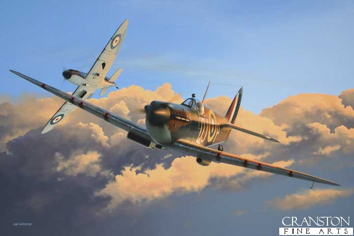 A pair of Spitfire Mk 1s of 92 Sqn, based at Pembrey, practising dogfight tactics in a rare moment of relative peace in August 1940. Nearest aircraft, N3249, (QJ-P) is that of Sgt Ralph Titch Havercroft who was to score 3 confirmed victories, 2 unconfirmed, one shared and three probables during his combat career.