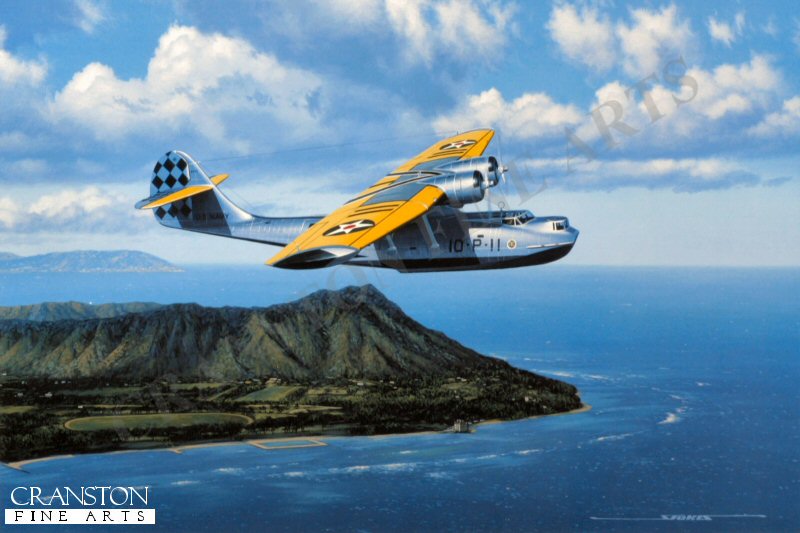 The Consolidated PBY Catalina, the sea going flying workhorse of the US Navy during WW II, is with no doubt the most successful flying boat ever produced. Produced for more than ten years, it was built in greater numbers (3,300) than any other flying boat in history. In the early days of aviation flying boats made a lot of sense because of the relatively limited number of prepared airfields. Any estuary, river, or lake could become an airfield for an aircraft designed as a flying boat. Consolidated Aircraft got into the flying boat business rather late in the game. In 1928 the company won a bid to produce a prototype of a new high-wing monoplane flying boat for the Navy which would utilize aluminum in its fabrication. The XPY prototype was successfully flown in early 1929, but the Glen L. Martin Co., one of the pioneers in flying boat production, won the production contract. Not deterred by this setback, Consolidated utilized the expertise it had developed on this project to introduce a commercial 28-passenger flying boat called the Commodore. This aircraft was utilized by a number of airlines including Pan Am. Concurrent with work on the Commodore the Consolidated design team set about developing an improved version of the XPY. This design (the P2Y-1) had an enclosed cockpit, and was designed to handle either two or three engines. A total of 47 P2Ys were put in service. As production commenced on the P2Y, Consolidated began work on another improved flying boat which would be considerably larger than the P2Y. The prototype of this new aircraft (the XPY-3) utilized retractable wing floats. In 1935 Consolidated won the initial production order for the first PBY-1s in 1935. In 1936 another fifty aircraft were ordered as the PBY-2 derivative. A PBY-2 based in Hawaii is depicted in its pre-war markings over Diamond Head, in Stan Stokes painting entitled Wings Over Waikiki. This version lacked the fuselage window blisters which would be used on later variants. The PBY-2 had a wing span of 104 feet, and was nearly 64 feet in length. Powered by two 850-HP Pratt and Whitney R-1830-64s, the PBY-2 had a maximum speed of 178-MPH, and a range of more than 2,000 miles. The British ordered more than 100 PBYs in 1939. They called the aircraft Catalina. Also in 1939 a number of Catalinas were modified into amphibians by adding a retractable tricycle undercarriage. This added more than 2,000 pounds to the weight of the aircraft, but also improved its versatility. In the first few days following the Japanese attack on Pearl Harbor, many of the PBYs deployed throughout the Pacific were damaged or destroyed. The PBYs were vulnerable to enemy fighter attack when in the air. Despite these early setbacks, the Navy learned to make good use of the PBY as the war progressed. One of the most effective uses of the aircraft was in night search and attack missions, where the aircraft were generally painted all black. These Black Cats operated from island bases and seaplane tenders and effectively hampered night time movement of enemy supplies. The Catalina also flew many Dumbo missions during the war rescuing downed allied aviators. Many thousands of lives were saved during these missions.