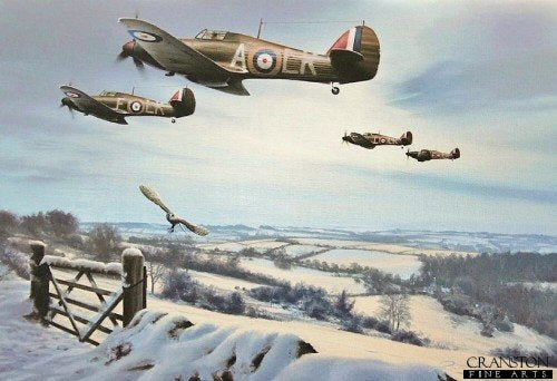 The Hurricane was the RAF's first fighter capable of flying at over 300mph and proved to be one of the most rugged fighters in the history of combat aviation. Hurricanes fought with distinction in the Battle of France and, during the Battle of Britain, shot down more enemy aircraft than its famous counterpart, the Spitfire. Richard Taylor's superb painting hints at the bitter fighting that lies ahead. A few months ago they had been fighting for their lives during the Battle of Britain but for now the snow-clad tranquility of an English winter brings a brief, but welcome, relief for the Mk.1 Hurricane pilots of 87 Squadron.