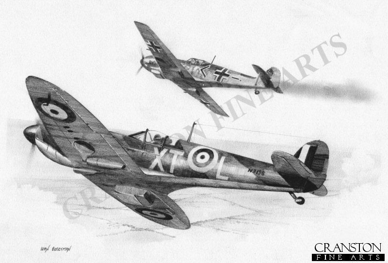 Gerald Stapme Stapleton in his 603 Sqn Spitfire despatching the Bf109 of Franz von Werra of III/JG 3.